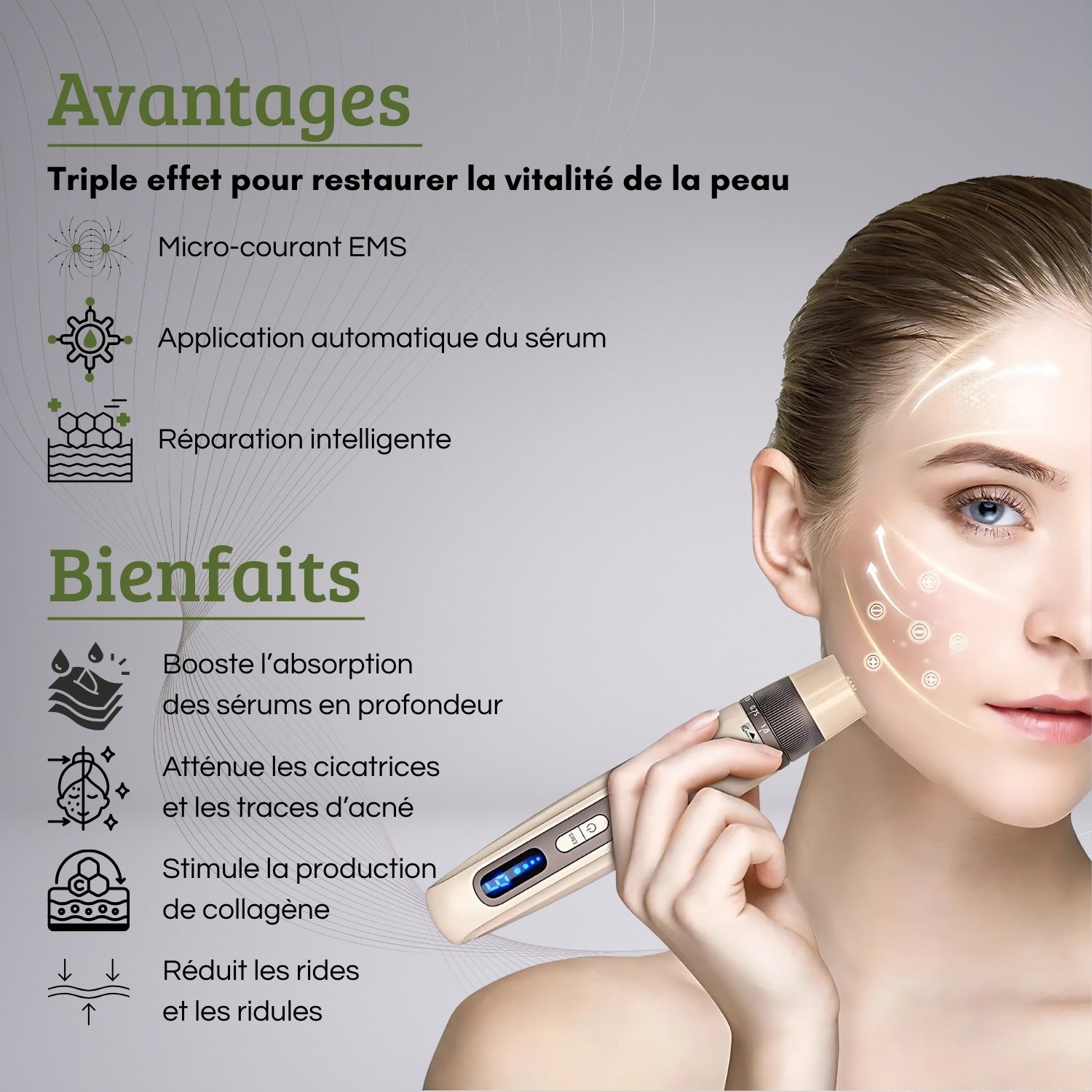 - Règle l’intensité, la longueur des aiguilles et la quantité de sérum (vibration + EMS).