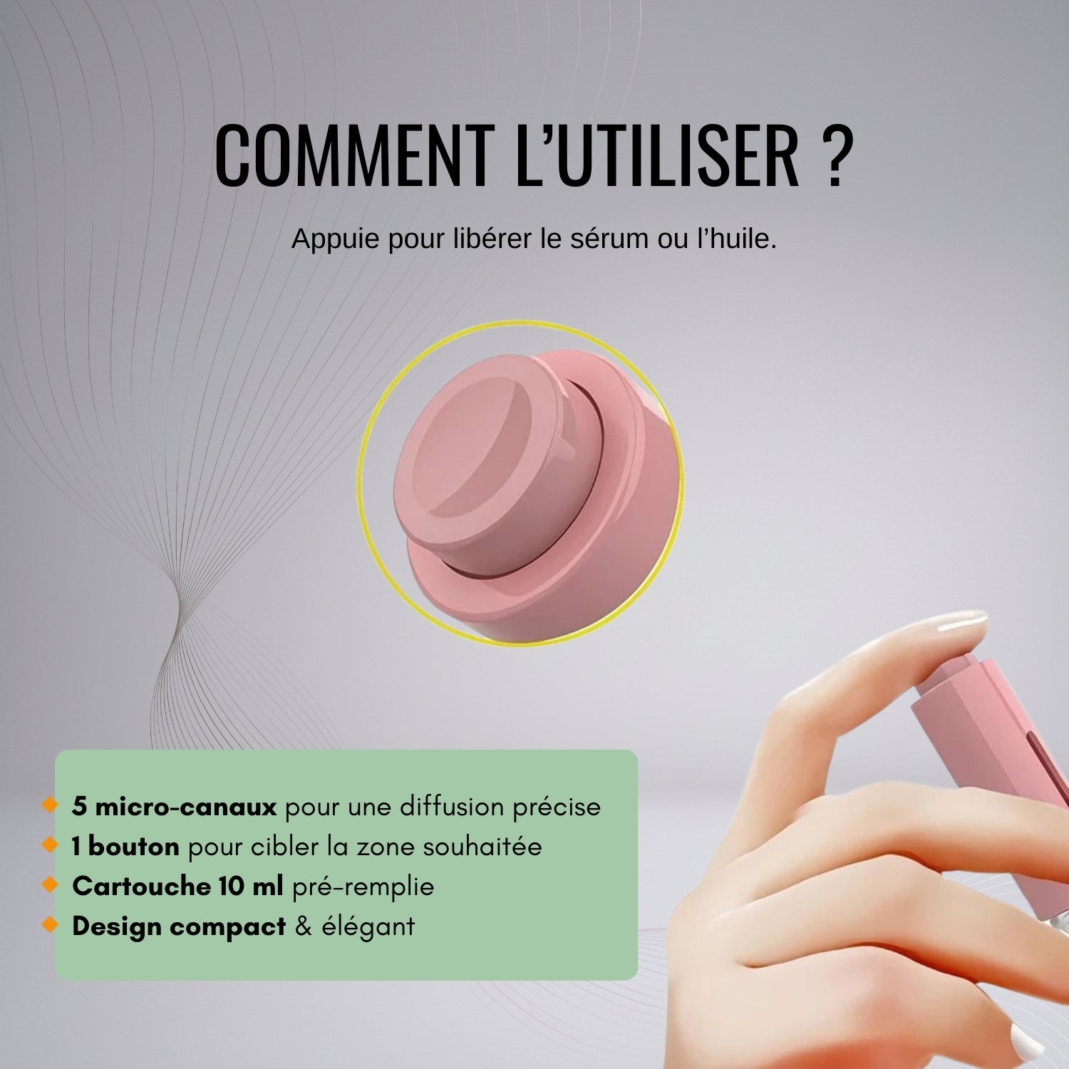 • Appuie délicatement sur le bouton pour distribuer une fine dose de produit.