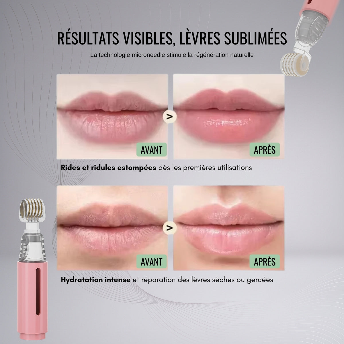 Résultats visibles : lèvres plus lisses et rebondies, peau revitalisée en 2 à 3 semaines.