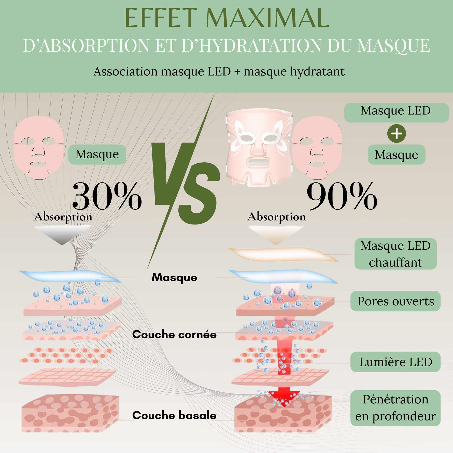 ✔ Correction des taches pigmentaires : la lumière verte régule la mélanine pour un teint plus uniforme.