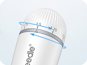 Grâce à sa bague de réglage 0,25–2,0 mm, tu adaptes la profondeur selon la zone et l’objectif : 0,25–0,5 mm pour l’éclat et la pénétration des actifs sur le visage, longueurs supérieures réservées aux usages plus ciblés et, de préférence, encadrés par un pro. Le format “stamp” travaille verticalement (sans traction), pour une action nette et homogène sur les zones difficiles (pattes d’oie, joues, menton).