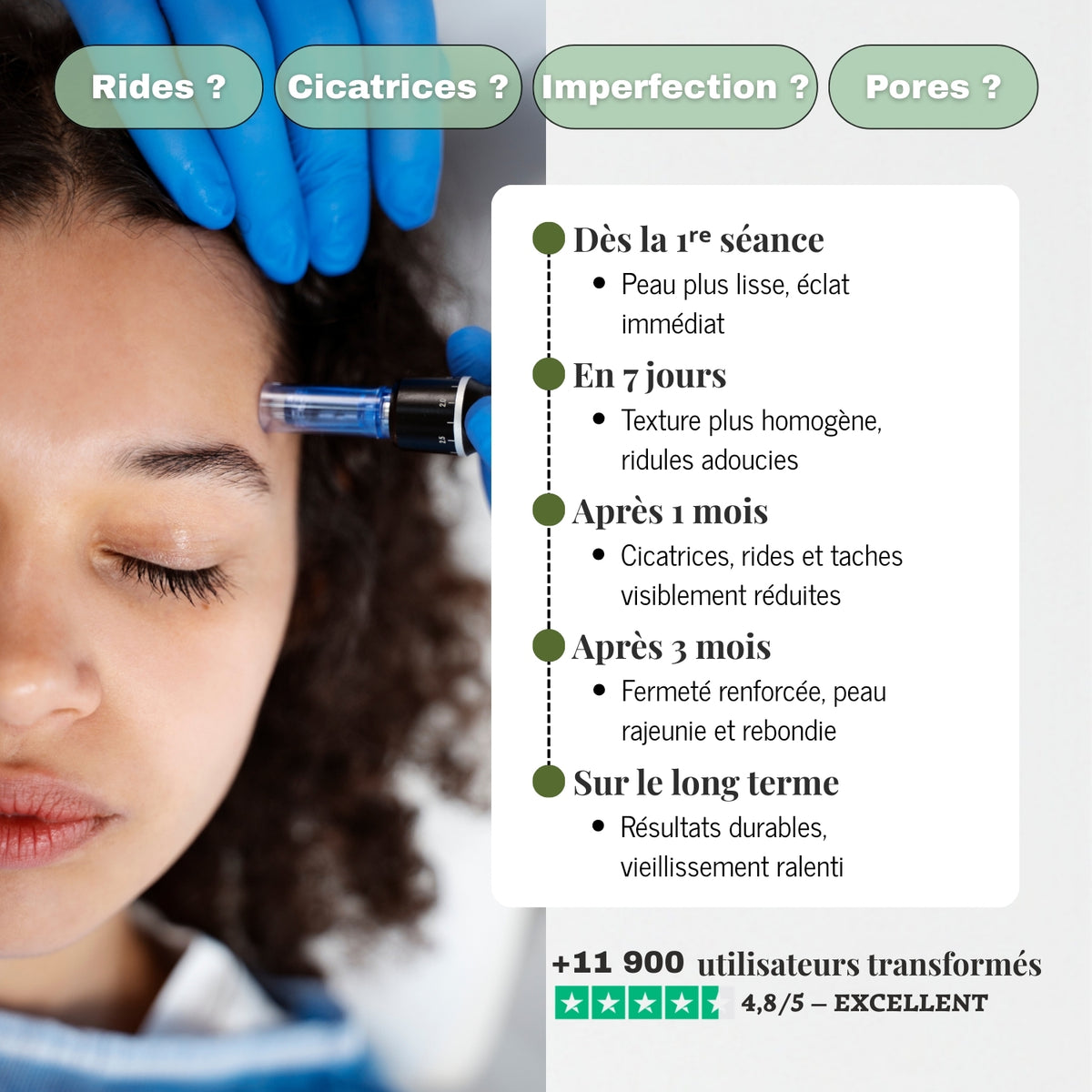 👉 Plusieurs séances régulières sont nécessaires, associées à une routine post-traitement adaptée, pour obtenir des résultats visibles et durables.