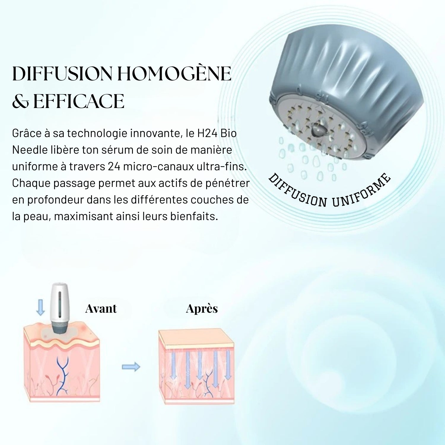 Équipé d’un réservoir intégré de 10 ml et d’aiguilles réglables de 0 à 1,5 mm, il combine action mécanique et diffusion contrôlée des actifs pour des résultats visibles, rapides et uniformes.