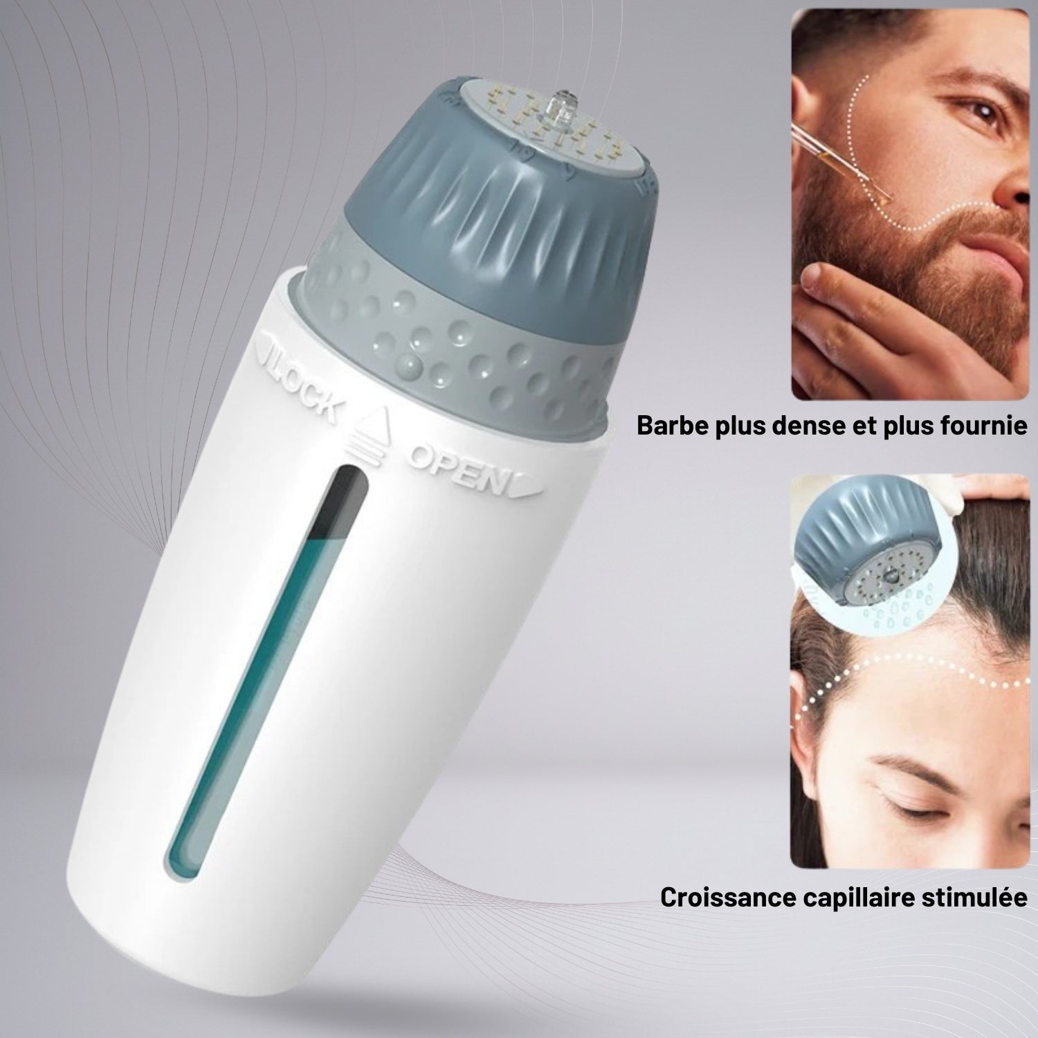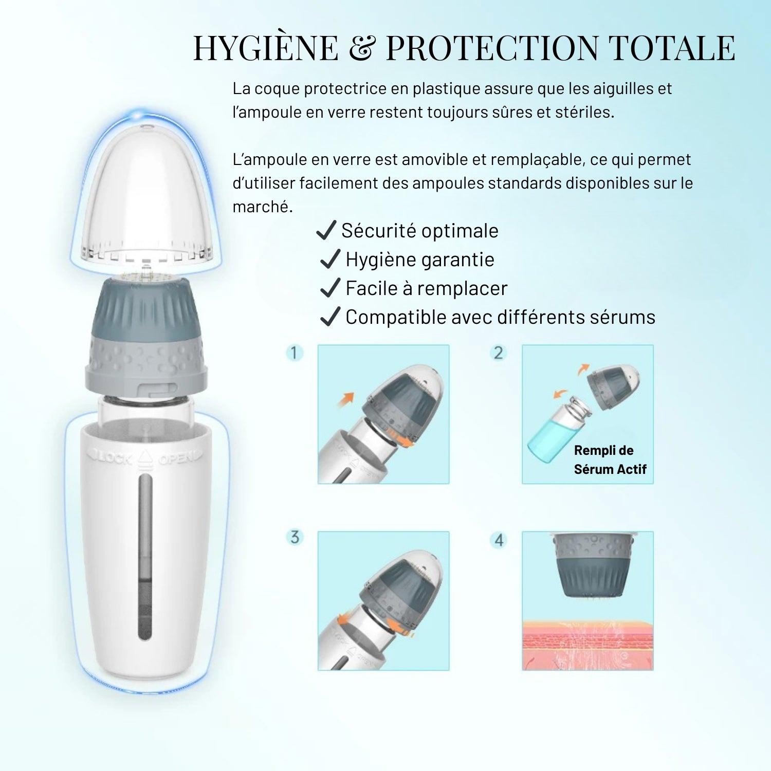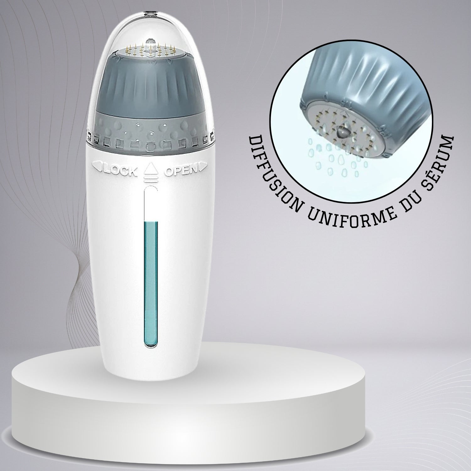 Son design ergonomique, son mécanisme fluide et son système hygiénique à double protection garantissent un usage propre, stable et sécurisé. Le réservoir intégré permet une diffusion uniforme du sérum choisi — vitamine B, acide hyaluronique, peptides ou sérums capillaires — sans gaspillage et avec une absorption optimisée.