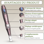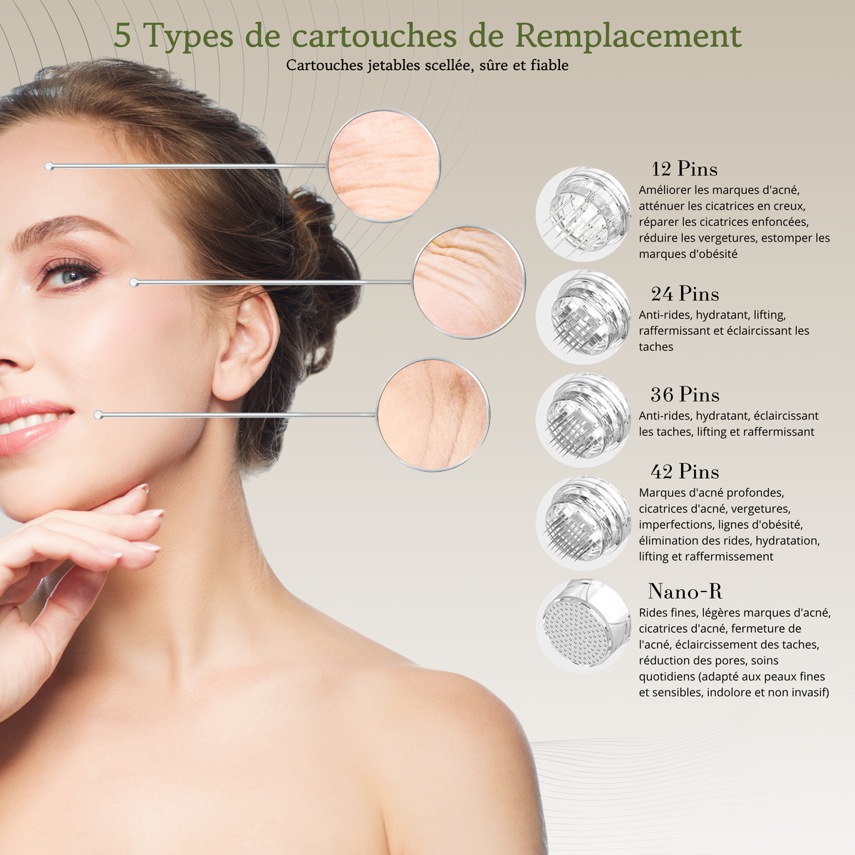Compatible avec plusieurs types de cartouches (12, 24, 36, 42 broches et nano rondes), il s’adapte à chaque zone du visage ou du corps, selon vos besoins spécifiques.
